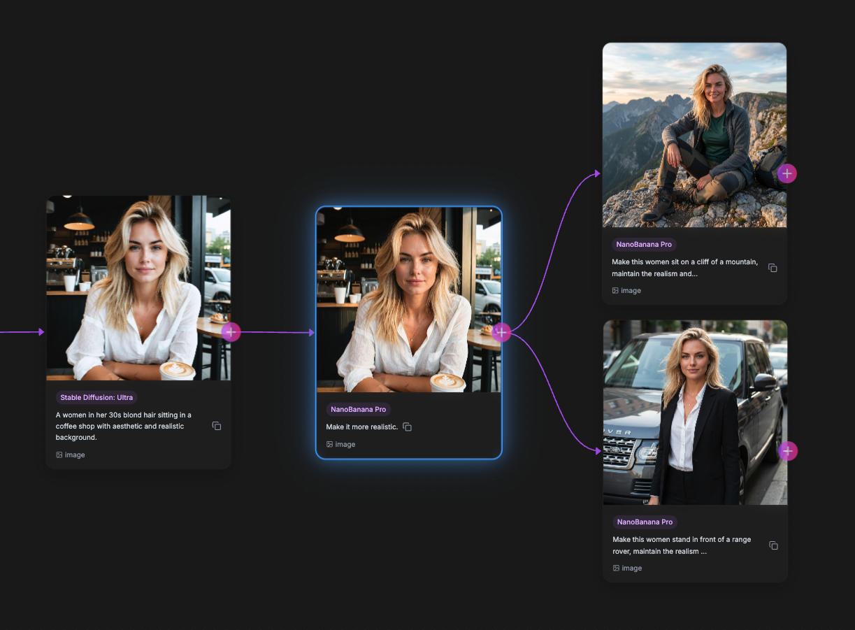 "The node-based UI makes character consistency feel automatic. I can keep the same character across different settings and lighting, all within one canvas, without any extra effort."